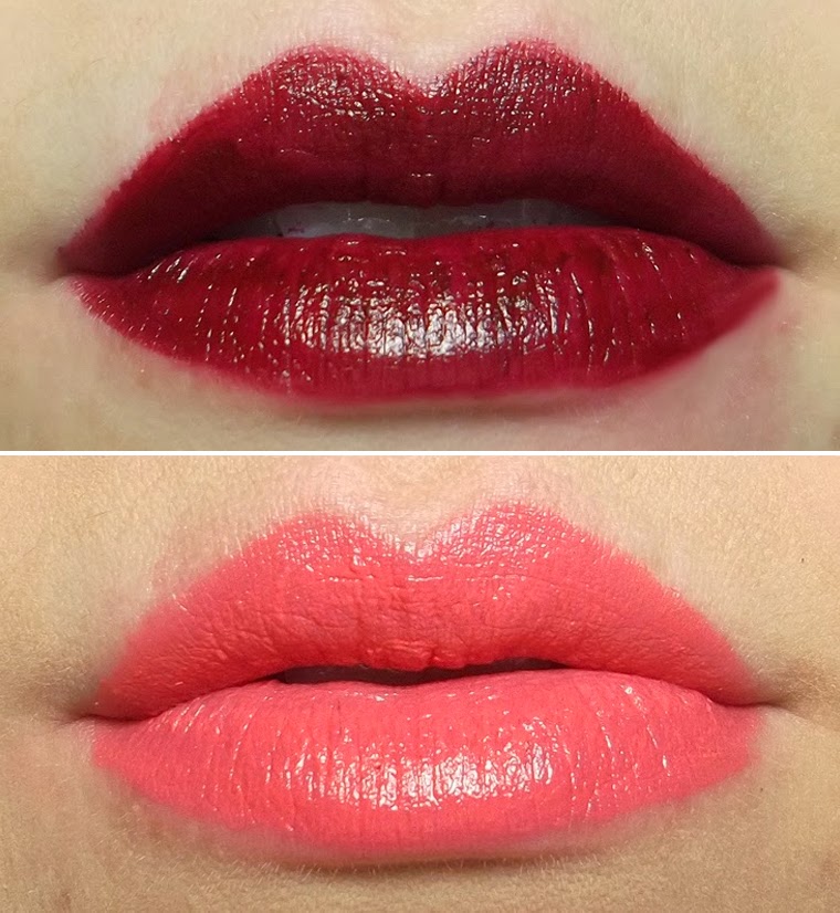O 282 é um vinho cremoso, uma cor muito elegante e que destaca muito os lábios. Já o 284 é uma cor mais veranil, um coral levemente alaranjado que dá um up em qualquer maquiagem. Os dois tem características muitos parecidas: boa pigmentação, cobrem na primeira camada, duração digna (cerca de 4/5 horas se você não comer nada), são cremosos e bastante hidratantes. A bala desliza muito fácil nos lábios e os deixa com uma sensação gostosa de hidratação, além de não destacar as linhas finas dos lábios.