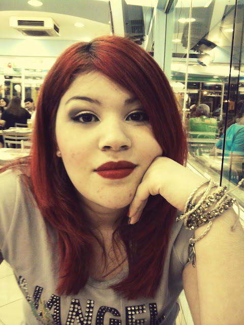 Na foto abaixo usei a sombra Folha Seca esfumada com Expresso que é opaca, batom Ruby Woo da Mac.