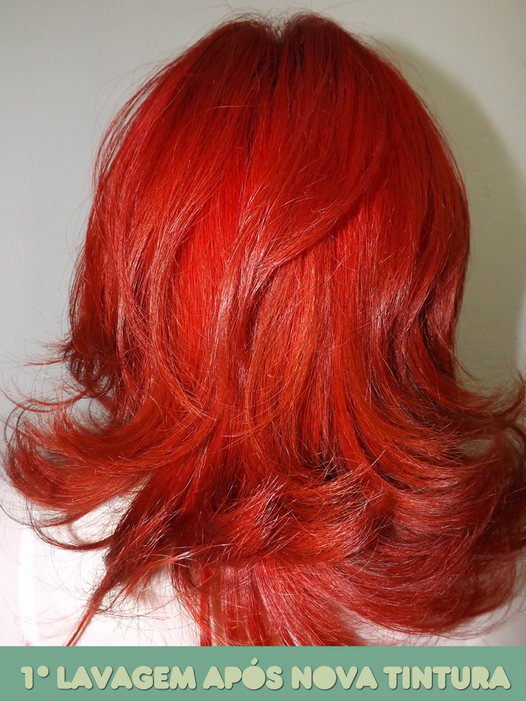 Depois de deixar a máscara agir por 10 minutos, lavei e voltei a minha vidinha normal e constatei uma coisa: que houve desbotamento na primeira lavagem pela baixa qualidade da tintura que eu estava usando, pois usando a Cult Red da Kert quase não houve desbotamento e além disso o cabelo se manteve hidratado e leve (resultado da combinação do produto + tintura).