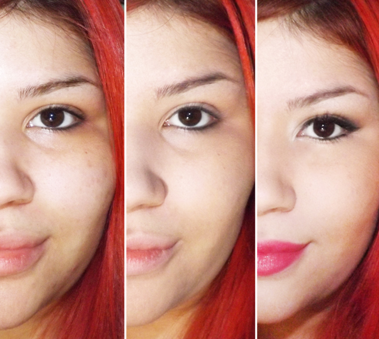 Ahhh odeio fazer foto assim mas é a mais pura verdade! ahahaha, na primeira foto, meu rosto manchado e limpo. Na segunda foto a aplicação da base e na terceira a make completa, com corretivo, pó, sombra, batom, blush e tudo que tem direito.