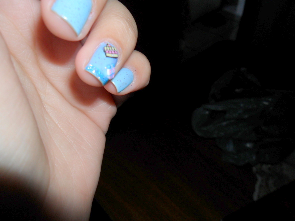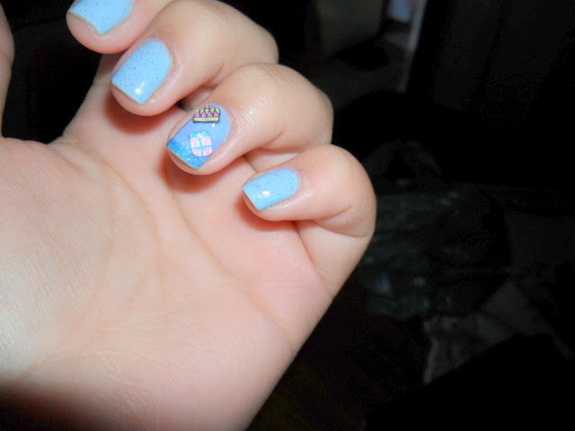 pra ficar assim eu usei uma camada de base fortalecedora, duas camadas do lindo amável azul e uma de extra brilho *-* no anelar coloquei dois fimos, uma coroa e um pacotinho de presente e fiiz uma francesinha com um azul holografico *-*