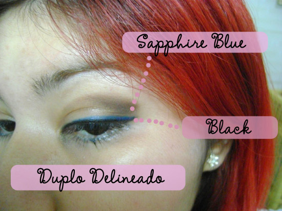Aqui fiz um Duplo Delineado, com a ponta bem apontadinha, passei bem rente aos cílios, primeiramente o lado Black e em cima o Saphhire Blue.