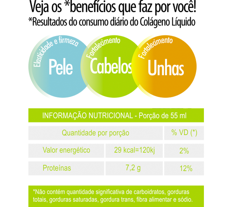A embalagem vem com 6 unidades e custa aproximadamente R$30. O frasco contém 55 ml (8 gramas de colágeno, fornece 25% das necessidades diárias de vitamina C)  e tem valor calórico bem baixo, veja na tabela a seguir: